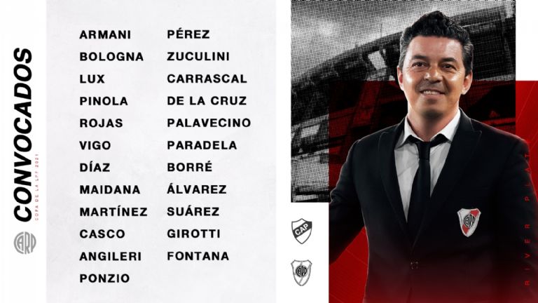 La posible formación de River: Franco Armani; Casco o Vigo, Paulo Díaz, Robert Rojas, Javier Pinola, Fabricio Angileri; Nicolás De La Cruz, Enzo Pérez, Jorge Carrascal; Rafael Santos Borré y Matías Suárez.